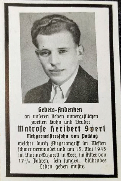 Matrose | SPERL | Heribert | 15.11.1927 Pocking | 15.05.1945 Marinelazarett Leer | Fliegerangriff, gestorben, Kriegsgräberstätte in Leer, Ev.- luth. Friedhof: Reihe 5Li |