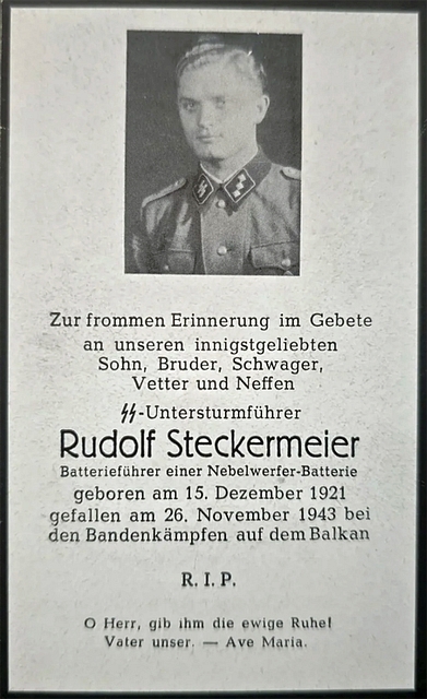 SS‑Untersturmführer | STECKERMEIER | Rudolf | 15.12.1921 | 26.11.1943 Balkan | Nebelwerfer-Batterie |