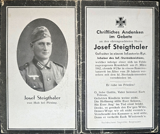 Gefreiter | STEIGTHALER | Josef | 19.03.1913 Burghausen | 21.03.1942 Lazarett Kirchseeon | Infanterie Regiment, Wehrmacht Fürsorge und Versorgungsamt München | gestorben |
