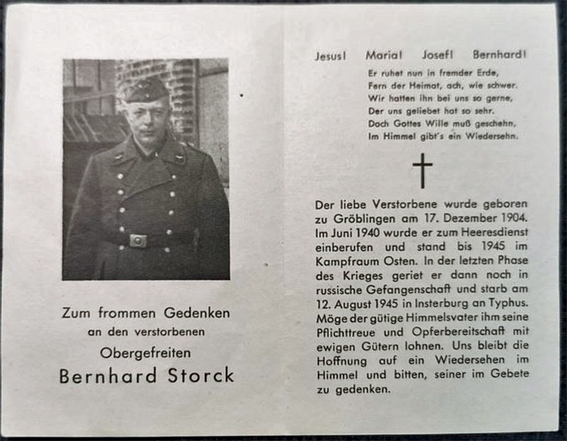 Obergefreiter | STORCK | Bernhard | 17.12.1904 Gröblingen | 12.08.1945 Seuchenlazarett Insterburg | an Typhus gestorben, Kriegsgräberstätte in Cernjachovsk/Tschernjachowsk |