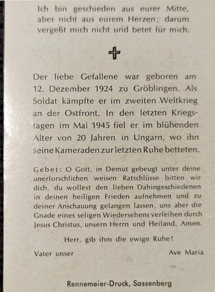 Gefreiter | STROTMEIER | Heinrich | 12.12.1924 Gröblingen | 05.1945 Ungarn | 357. Art.‑Reg. |