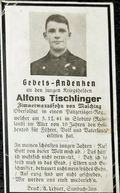 Obersoldat Schütze | TISCHLINGER | Alfons | 11.01.1923 Malching | 05.12.1941 Slobino, Rußland, Roshestwo ca. 20 km nördl. Jelez a.d.Bahn Jeffremow | 1. Komp. Panzerjäger Reg., Abt. 262 | durch Fliegerbombe |