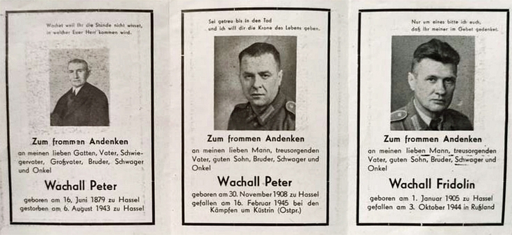 Gefreiter | WACHALL | Fridolin | 01.01.1905 Hassel | 03.10.1944 Rußland, Kgf.Lag. Odessa | WACHALL Friedel |