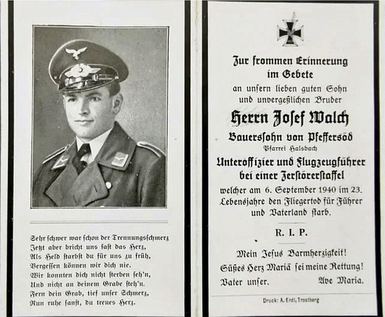Unteroffizier Flugzeugführer | WALCH | Josef | 22.12.1917 Unterschnitzing, Kreis Laufen | 06.09.1940 Søsum | 2. Staffel Zerstörergeschwader | Kriegsgräberstätte in Kopenhagen West: Block B Reihe 13 Grab 713 |