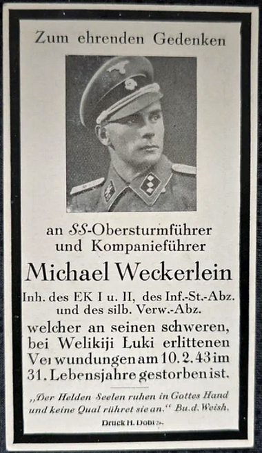 SS‑Obersturmführer | WECKERLEIN | Michael | 08.05.1912 Rottach | 10.02.1943 Lazarett Warschau-Powadzki | SS Totenkopf Inf. Regt. 8 | gestorben |