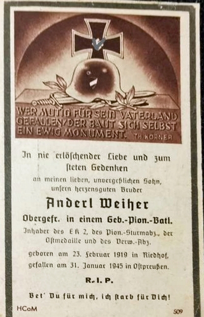 Obergefreiter | WEIHER | Anderl | 23.02.1919 Riedhof | 31.01.1945 in Ostpreußen | Geb.Pion.Batl. |