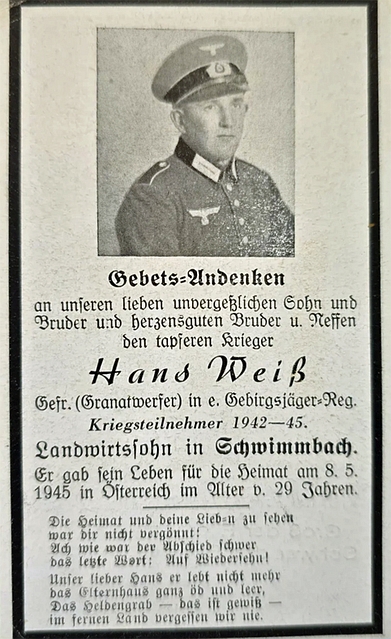 Gefreiter | WEIß | Hans | 16.04.1916 Schwimmbach | 08.05.1945 Reichenau, Mariazell, Österreich | Gebirgsjäger-Reg. | Granatwerfer, Kriegsgräberstätte in Graz/Steiermark: Feld 52b Reihe 25 Grab 608 |