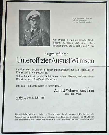 Unteroffizier | WILMSEN | Albert | 04.03.1913 Krefeld | 11.06.1937 Bilbao | J/88 Legion Condor | tödlich verunglückt, bei Tiefangriff abgeschossen |