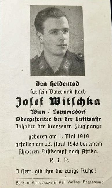 Obergefreiter | WITSCHKA | Josef | 01.05.1919 Chrzanow | 22.02.1943 Afrika, Cap Bon | 2./I. Transport Flug Geschwader 5 | im Luftkampf gefallen, Kriegsgräberstätte in Motta St. Anastasia: Gruft 1 Reihe 3 Platte C Sarkopharg 103 |