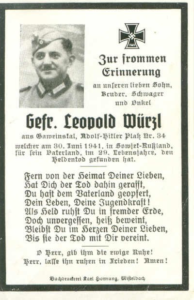 Gefreiter | WÜRZL | Leopold | 08.11.1911 Gaweinstal | Gaweinstal | 30.06.1941 b. Aleksandrowka |