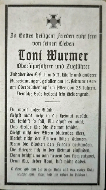 Oberscharführer | WURMER | Toni | 30.03.1922 Mittenwald | 14.02.1945 Oderbrückenkopf | Zugführer, Kriegsgräberstätte in Frankfurt/Oder: Abteilung S5 Reihe 3 Grab 59, WURMER Anton |