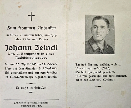 Unteroffizier | ZEINDL | Johann | 20.04.1945 Flugplatz in Lübeck | Bordfunker, tödlich verunglückt, begraben Friedhof Lübeck‑Blankensee |