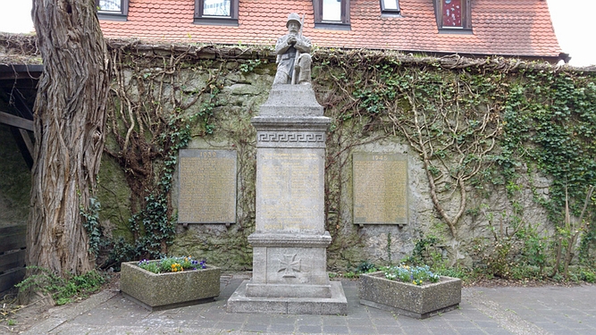 Ein betender Soldat kniet auf dem Steindenkmal der Gemeinden Uehlfeld und Weickersdorf mit Voggendorf bei der St. Jakobus-Kirche.