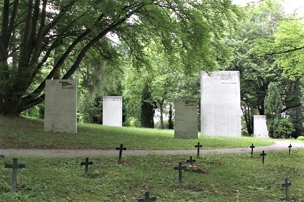 Im Hauptfriedhof in der Nähe der Kriegsgräber mehrere unterschiedlich große Betonwände, Inschrift nur auf einer Seite.