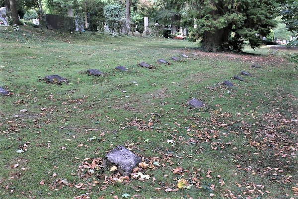Im Hauptfriedhof, Abt. 61: Kriegsgräber aus dem Zweiten Weltkrieg, zwei Reihen mit Steinplatten am Boden; Texte nicht mehr lesbar.