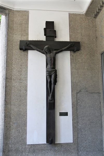 Nach dem Kruzifixus am Waldfriedhof des ehemaligen Ulmer Grenadierregiments 123 in den Westargonnen 1915 von einem Regiments-Angehörigen für die Evang. Garnisonskirche - Pauluskirche - aus eine Argonnen-Eiche geschnitzt.