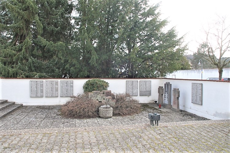 Bei der Kirche: Sechs Tafeln an der Wand und drei Kriegsgräber,