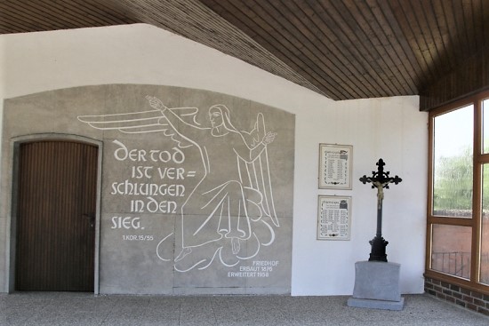 Zwei Gedenktafeln unter dem Vordach der Aussegnungshalle, daneben Bildgrafik.