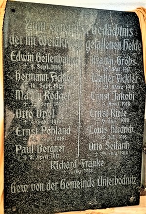 Vor der Nikolaikirche in Unterbodnitz befindet sich das Kriegerdenkmal, das ursprünglich den Gefallenen des Ersten Weltkrieges gewidmet war.