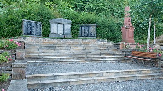 Kriegerdenkmal auf dem alten Friedhof, drei Gedenksteine mit daran befestigten acht Gedenkplatten und einer Inschriftentafel.