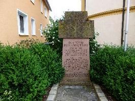 Denkmal aus Sandstein in Form eines Kreuzes.