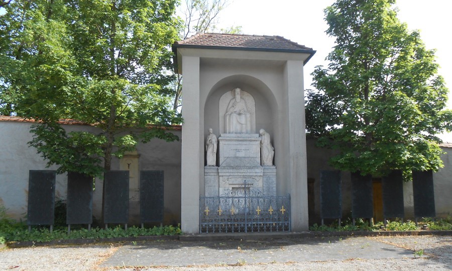 Überdachtes Denkmal auf dem Friedhof. Außen, auf den Säulen, eine Figur, darunter die Namen des Ersten Weltkriegs.