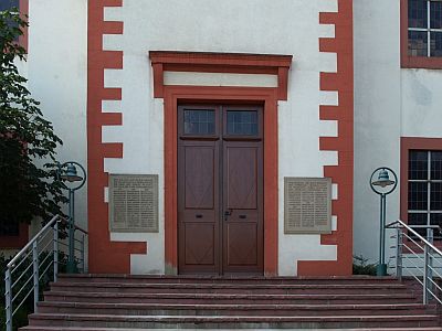 An beiden Seiten des Einganges in die evangelische Kirche, sind zwei Gedenktafeln angebracht