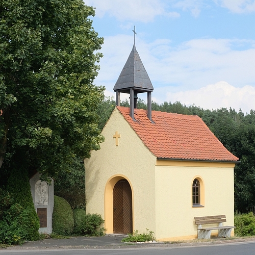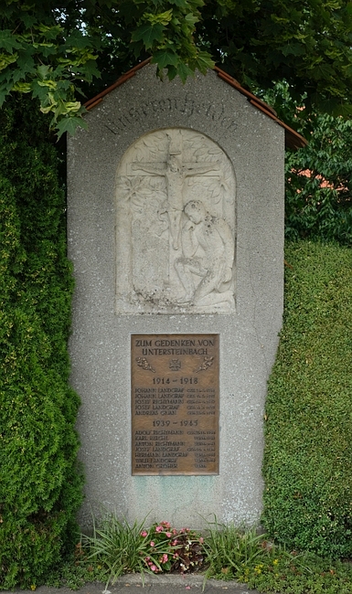 Kriegerdenkmal neben der Kirche. Unter einer Sterbeszene befindet sich die Gedenktafel.