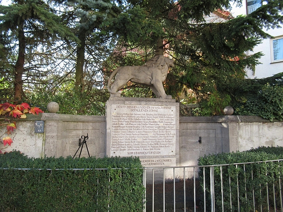Ein Löwe steht auf dem Denkmal mit der Namenstafel für den 1. Weltkrieg.