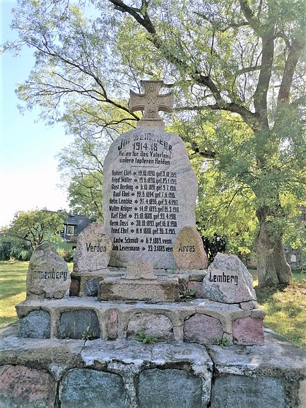 Auf einer höher liegenden Wiese bei der Dorfkirche steht das Denkmal (Erster Weltkrieg) auf einem dreistufigen Sockel aus vermauerten Granitquadern.