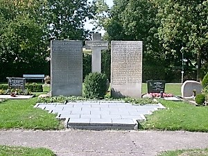 In der Mitte auf dem neuen Friedhof stehen zwei große Gedenksteine mit Namen, dazwischen steht ein großes Steinkreuz. Rechts und links liegt ein kleiner Findling, davor sind sich zu den Gedenksteinen öffnende Wegeplatten verlegt. Die Gedenkstätte ist mit Immergrün bepflanzt, gepflegt und umgeben von Rasen.