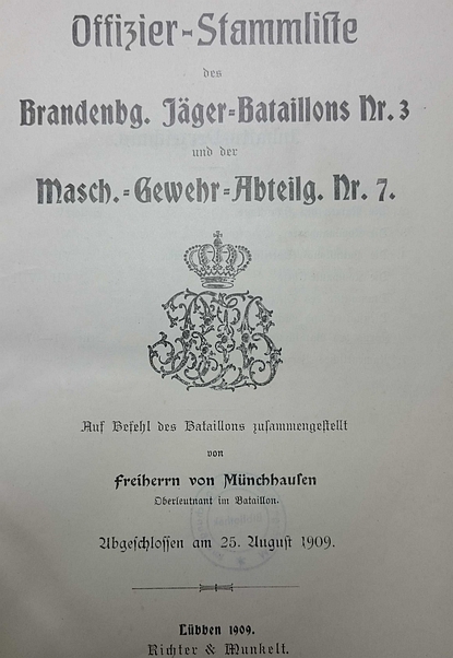 Auf Befehl zusammengestellt von Freiherr von Münchhausen, Oberleutnant im Bataillon. Lübben 1909. Richter & Munkelt.