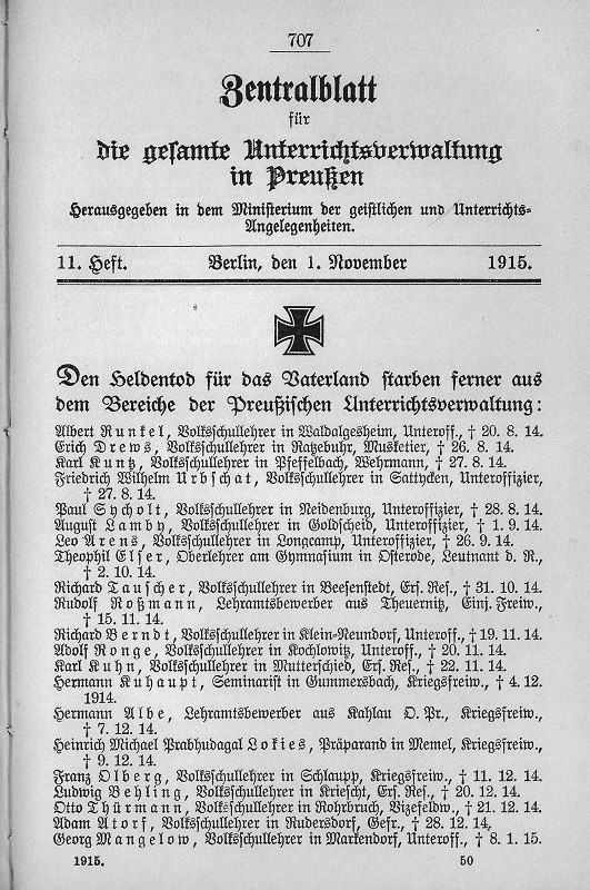 Den Heldentod für das Vaterland starben aus dem Bereich der Preußischen Unterrichtsverwaltung: