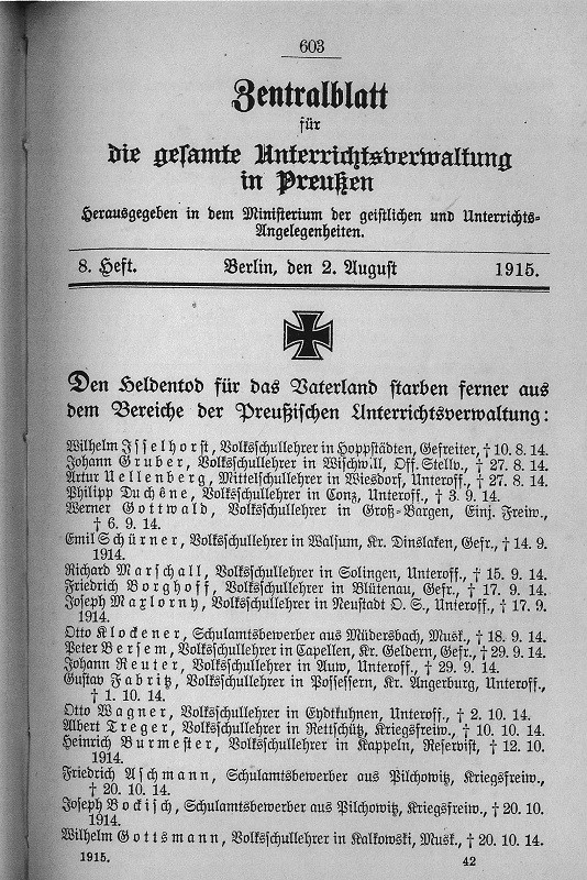 Den Heldentod für das Vaterland starben aus dem Bereich der Preußischen Unterrichtsverwaltung: