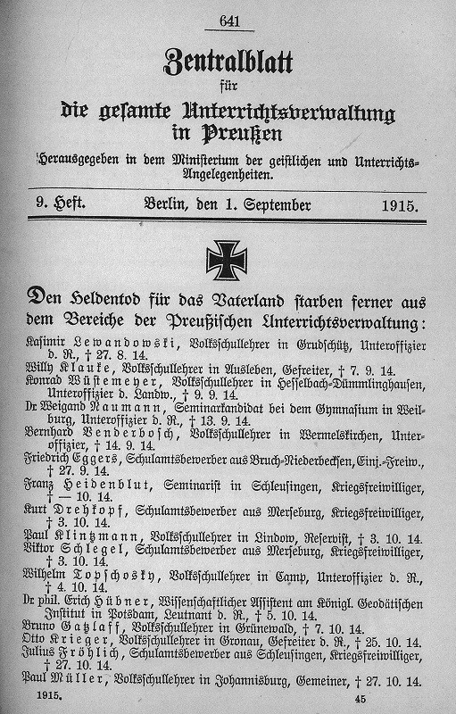 Den Heldentod für das Vaterland starben aus dem Bereich der Preußischen Unterrichtsverwaltung: