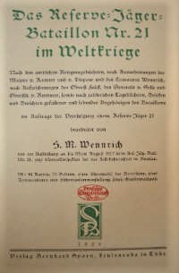 Quelle: Nach den amtlichen Kriegstagebüchern, nach Ausarbeitung der Majore v. Kautter und v. Diepow und des Leutnants Wennich, nach Aufzeichnungen des Oberst Falck, des Generals v. Selle und Oberstleutnant v. Kummer, sowie nach zahlreichen Tagebüchern, Briefen und Berichten gefallener und lebender Angehörigen des Bataillons im Auftrage der Vereinigung ehemaliger Reserve-Jäger 21 bearbeitet von S.M. Wennich, von der Aufstellung an bis Mitte August 1917 beim Reserve-Jäger-Bataillon Nr.21, jetzt Oberzollinspektor bei der Zoll-Lehranstalt in Breslau.