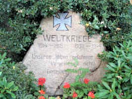 Um ein Holzkreuz sind mehrere Findlinge mit Namen der Gefallenen beider Weltkriege angeordnet.
