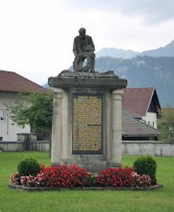 Bei der Kirche; dreieckige Säule, oben mit kniendem Soldaten und Lorbeerkranz, Gedenktafeln an allen Seiten.