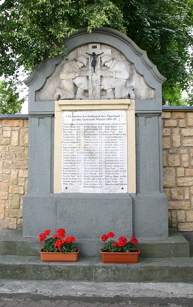 Schmales Denkmal an der Mauer des ehem. Friedhofes im Ortsmittelpunkt. Frontseite ist oben mit einem schönen Relief zweier knieender Soldaten verziert. Aus der Mitte ihrer aufgestellten Gewehre erwächst ein Kreuz, vor dem sie sich verneigen. Der Giebel ist mehrmals geschweift. Darunter mittig die Namenstafel, von zwei Pilastern flankiert. Das Ganze ist durch drei Stufen etwas erhöht. Sowohl das Denkmal und auch die Umgebung sind schön gestaltet und gepflegt.