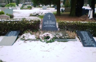 Auf dem Friedhof zwei liegende Steinplatten mit Namen ausländischer Toter, dazwischen ein stehender Stein mit Inschrift.