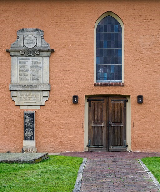 Marienkirche in Wardenburg: Säule an der Mauer (1870/71), darüber große Wandtafel (Erster Weltkrieg).