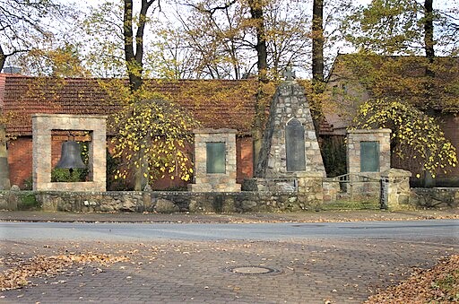 Kriegerdenkmal in Wehrbleck in der Dorfstraße: Freistehende Hauptstele, sich nach oben verjüngend;