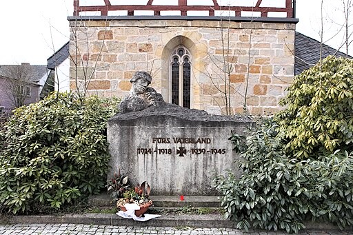 Kriegerdenkmal für die beiden Weltkriege in der Sonnefelder Straße: Rechteckiger Steinblock mit Soldatenkopf und Inschrift.