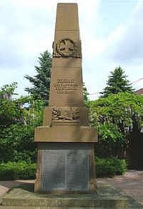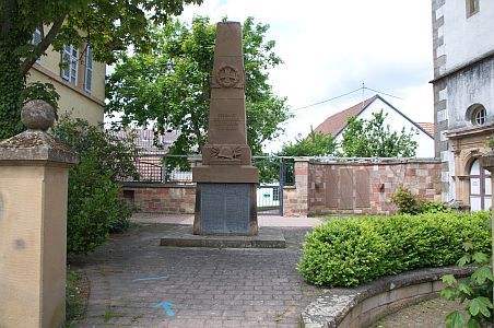 1. Weltkrieg: Obelisk aus hellem Sandstein auf dem Vorplatz der ev. Kirche.