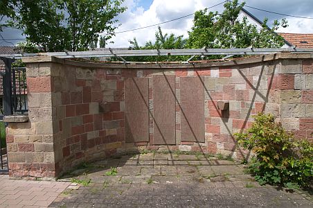 2. Weltkrieg: Drei rote Sandsteinplatten, eingelassen in einer halbrunden Sandsteinmauer auf dem Vorplatz der ev. Kirche.