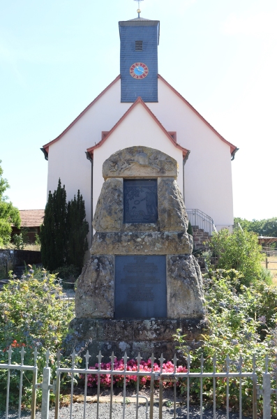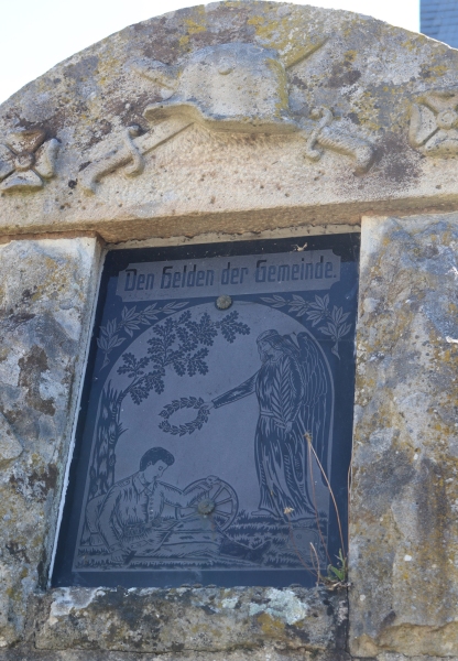 Gemauertes Denkmal in einer kleinen Anlage vor der Kirche. An der Vorderseite sind zwei schwarze Steintafeln eingefügt. Auf der Oberen befindet sich die Darstellung eines Gefallenen, dem ein Engel einen Lorbeerkranz auf den Kopf setzen will und auf der Unteren die Daten der Gefallenen des 1. Weltkrieges.