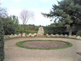 Gedenkstätte neben dem Friedhof: Hufeisenförmige Anordnung von kleinen, persönlichen Findlingen mit Namen und Daten der Gefallenen bzw. Vermissten.