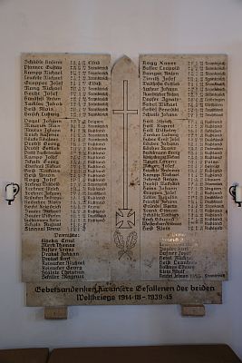 Kriegerdenkmal in der kath. Pfarrkirche Mariä Himmelfahrt. Steinplatten, in der Mitte ein Kreuz, darunter ein Deutsches Kreuz und Eichenlaub. Links und rechts daneben befinden sich die Namen.