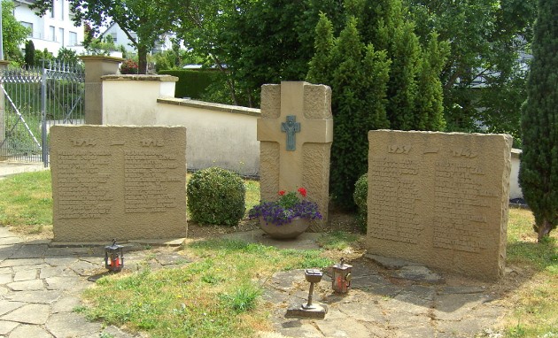 Kirche mit Friedhof: Drei Steintafeln, linke Seite mit den Namen des Ersten Weltkriegs, in der Mitte ein Stein mit Kreuz und rechte Seite mit den Namen des Zweiten Weltkriegs.