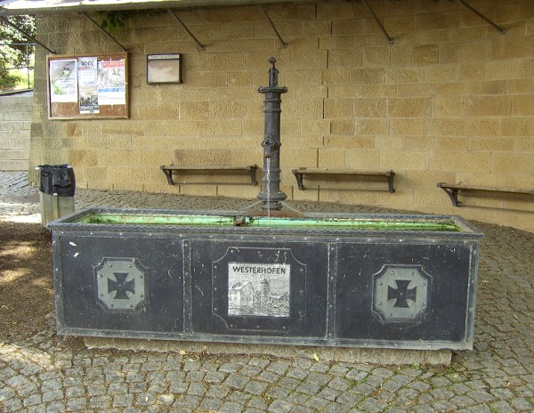 An der Straße vor einer Steinmauer mit Sitzbänke ein länglicher Brunnen mit Ortsbild von Westerhofen.